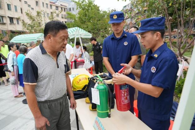 消防员拿起灭火器教居民辨认种类:“红色是干粉,绿色是水基,厨房用红色合适,电瓶车起火用绿色!”并指导居民操作,强调口诀“一提二拔三握四压”。居民们表示这样的宣传实用,遇到火灾知道应对方法了。