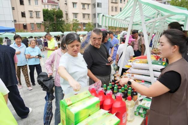 特色展销区最具吸引力。光明集团产品丰富,摆满两个摊位,工作人员举着试吃盒邀请居民品尝,吸引众多居民选购。