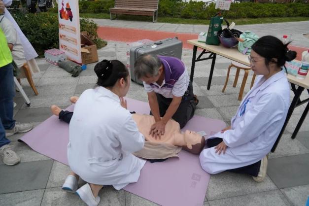 红十字急救示范区,急救员用人体模型模拟心肺复苏操作,居民上前尝试。专业指导让居民感叹:“电视里看着简单,其实有讲究!”