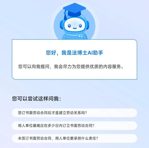 亮点一:智能问答 · 法博士在线解忧。遇到法律难题,输入问题,AI助手“法博士”精准解析,明确涉及的法律条文及适用原因;给出实用指引,指导具体做法、办理地点和流程。无论大小事,法博士都能提供权威、清晰、可操作的行动指南。