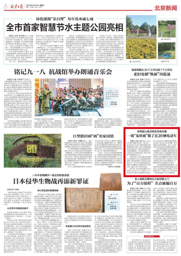 9月19日,北京日报报道《一场“及时雨”救了近20辆电动车》。近日,大兴区黄村镇新兴家园一里社区,电动自行车充电车棚北侧杂草被遗留火种引燃。火势即将蔓延至车棚时,车棚内红外火焰探测器及时探测到明火,自动喷水系统启动,快速扑灭了明火。