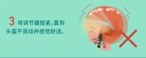 2. 调试好头盔后,打开束带,把头盔水平戴在头上,不能前仰或后翘。因为头盔前仰无法保护前额安全,后翘会挡住视线且不能保障头后部的安全。