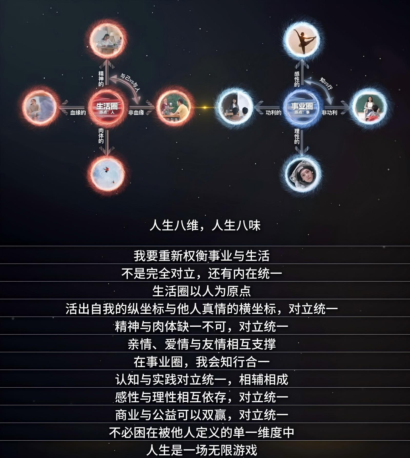能换得体验与喜悦的人生空间,可分为以事为原点的事业圈和以人为原点的生活圈,二者对立统一,矛盾动态转化。