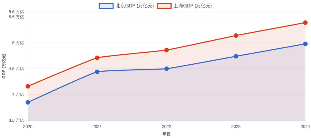 2023年,经第五次经济普查数据修正后,上海GDP达51404.47亿元,再度与北京拉开差距。2024年上海GDP达53926.71亿元,北京位列其后,GDP为49843.1亿元,两座城市分别以5.2%和5%的增速齐头并进。