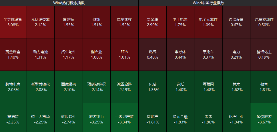 从板块来看,半导体设备板块走高,电子元器件、通信设备、储能等板块表现活跃,贵金属板块震荡拉升;而餐饮旅游板块走低,化纤、零售、房地产等板块震荡调整。个股方面,超4500只个股下跌。