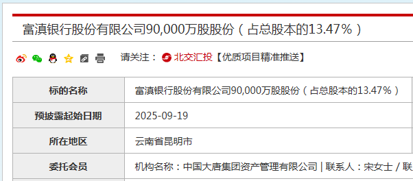 据北交所消息,富滇银行9亿股股份处于拟披露挂牌期,占总股本的13.47%,转让方是中国大唐集团财务有限公司,为该行第二大股东。