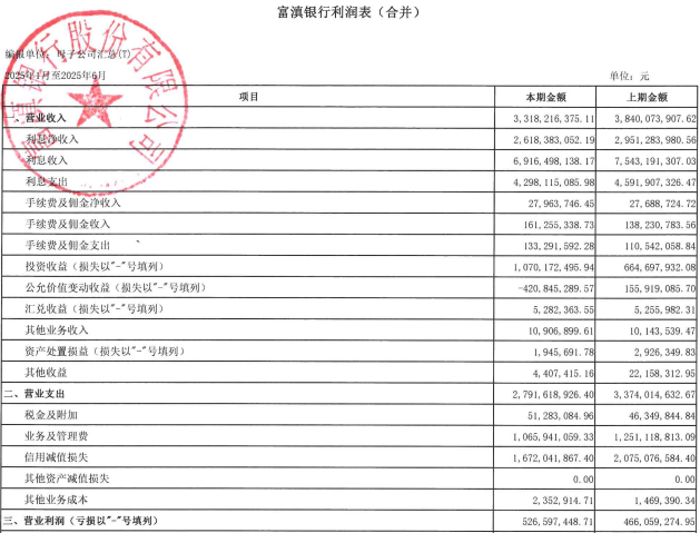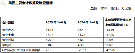 富滇银行2025年二季度报告显示,上半年集团营收33.18亿元,同比降13.59%;营业利润5.27亿元,同比增13.09%;净利润5.04亿元,同比增15.07%。
