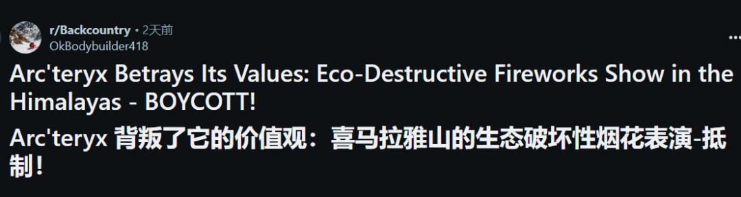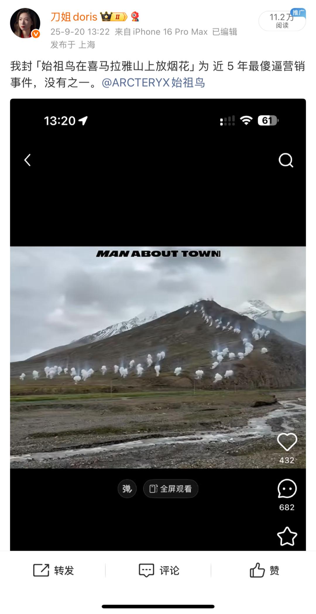 我顿时惊得目瞪口呆,气得牙都没刷就开始吐槽。始祖鸟,一个源于对高山探险敬畏与热爱的品牌,竟想在喜马拉雅山上用五颜六色的烟花来展示对高山的掌控和所谓的艺术创作,这简直荒谬至极!我当即认定,这是近5年来最糟糕的营销案例,没有之一。