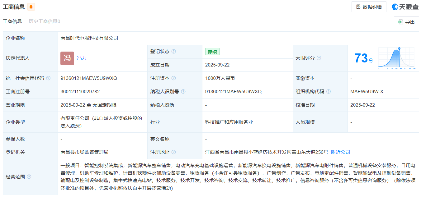 南昌时代电服科技有限公司于2025年成立,注册资本1000万元,经营范围有智能控制系统集成、新能源汽车整车销售、电动汽车充电基础设施运营、新能源汽车换电设施销售等。