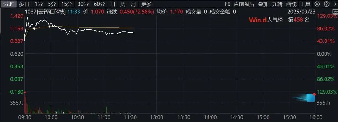 港股云智汇科技昨日早间暴涨134%后紧急停牌,今日复牌继续大幅高开高走,盘中一度飙升逾129%,两个交易日最高合计大涨逾435%。