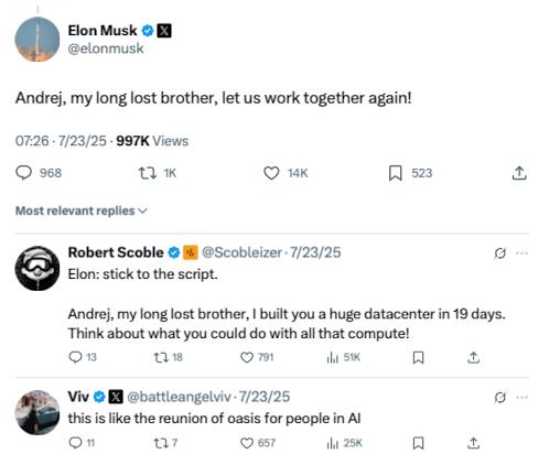 马斯克挖技术骨干时总是礼贤下士。OpenAI成立时,他从谷歌挖来首席科学家伊利亚·苏茨克维。为xAI组建团队时,他又亲自向OpenAI、谷歌和微软等公司的顶尖AI研究员发送邀请,成功说服多位重量级AI科学家加入。为请特斯拉前Autopilot业务负责人卡巴奇回来,马斯克公开称其是“自己失散多年的兄弟”。