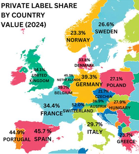 自有商品模式在国外很成熟。《2023年中国商超自有品牌案例报告》显示,Costco的自有品牌科克兰2021年销售额超590亿美元,占总收入的31%。山姆的自有品牌Members Mark销售占比也约为30%。在欧洲,这更是主流趋势。NielsenIQ数据显示,预计2024年自有品牌总销售额将达3520亿欧元,德国、英国和法国这三个最大食品杂货市场的自有品牌合计份额为39.7%。