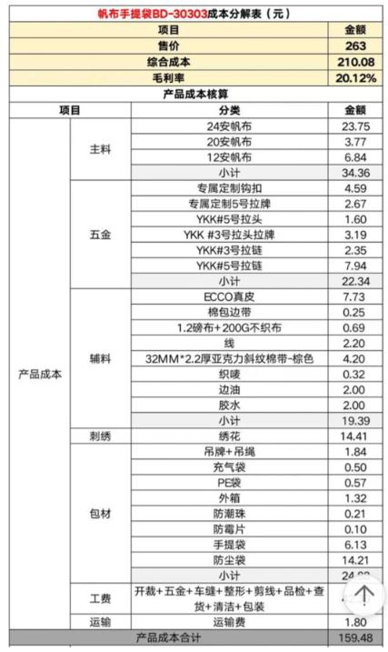 甚至还给出很多商品的成本分解表。
