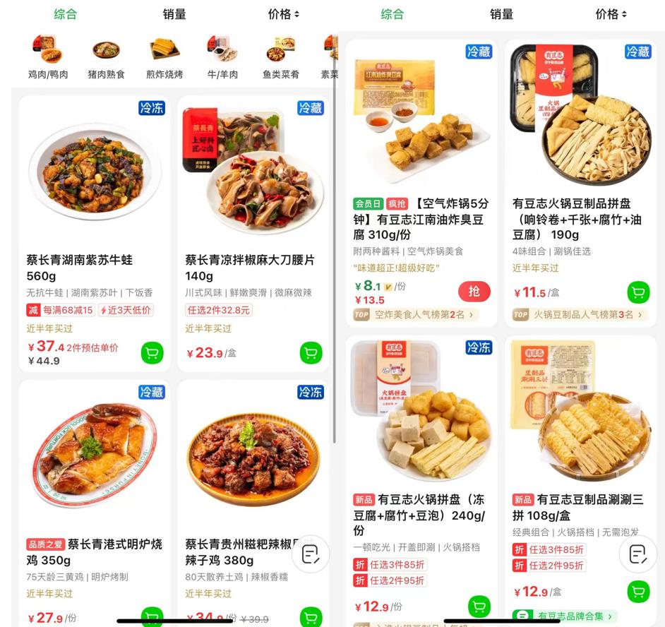 不只是零食,叮咚买菜上,卖豆腐的“豆有志”、卖面食的“良芯匠人”、快手菜“蔡长青”等都是叮咚的自有品牌。卖菜平台都快成食品公司了。