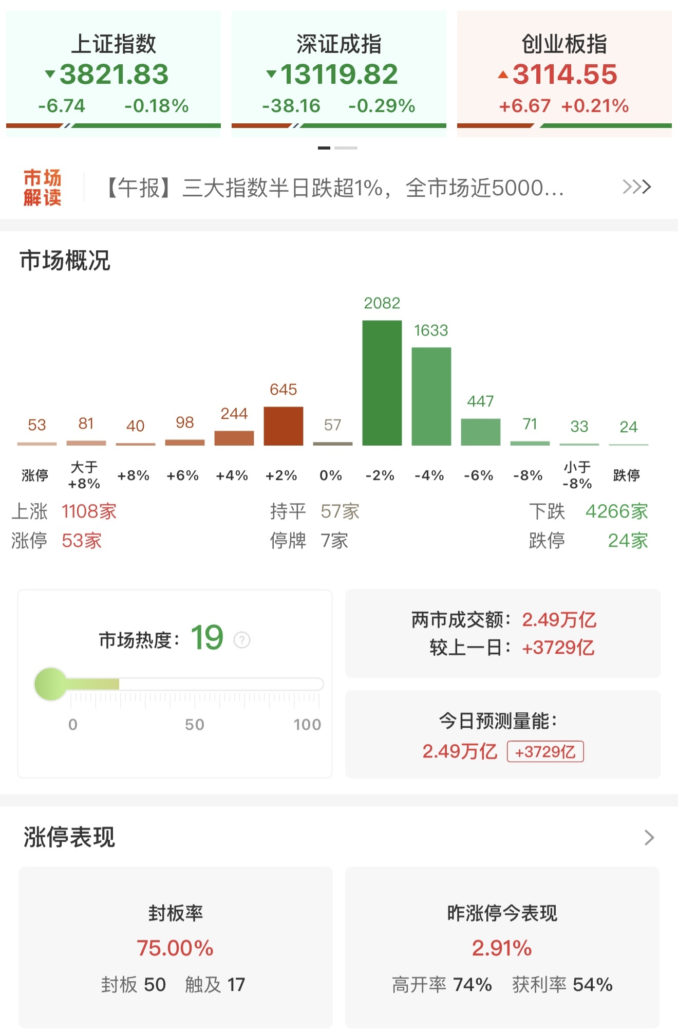 沪深两市成交额达到2.49万亿,相较于上一交易日增加了3729亿。收盘时,沪指下跌0.18%,深成指下跌0.29%,创业板指则上涨0.21%。