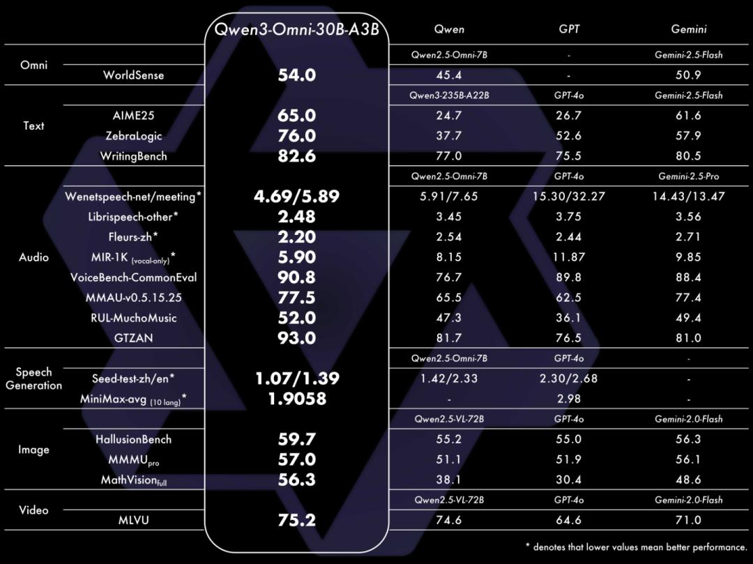 Qwen3 - Omni在全方位性能评估中,单模态任务表现与参数规模相当的Qwen系列单模态模型持平,音频任务表现更优。在36项音视频基准测试中,32项取得开源领域最佳性能,22项达到SOTA水平,超越了Gemini - 2.5 - Pro等闭源模型,在语音识别与指令跟随任务中达到Gemini - 2.5 - Pro相同水平。