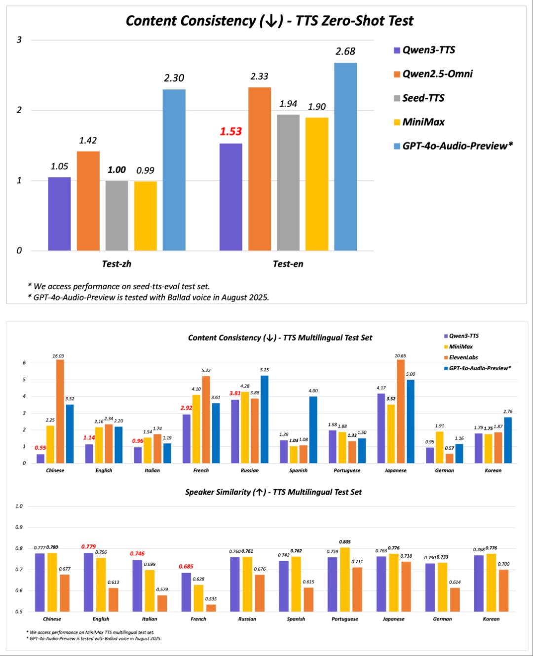 Qwen3 - TTS支持17种音色与10种语言,在语音稳定性与音色相似度评估中超越了SeedTTS、GPT - 4o - Audio - Preview等主流产品。