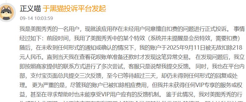 在消费者投诉平台黑猫投诉上,有9700余条投诉与美图旗下的美图秀秀、美颜相机和wink相关。大量投诉涉及“自动扣费”“恶意扣费”“乱扣费”等费用问题。有消费者在9月14日提交投诉称,“前段时间,我用了美图秀秀中的某个特效(系统并未提醒是会员特效,需要扣费),随后,在未收到任何形式的通知或确认的情况下,我的账户于2025年9月11日被无故扣除218元人民币。直到当天我在查看花呗账单准备还款时才发现这笔异常交易。 ”