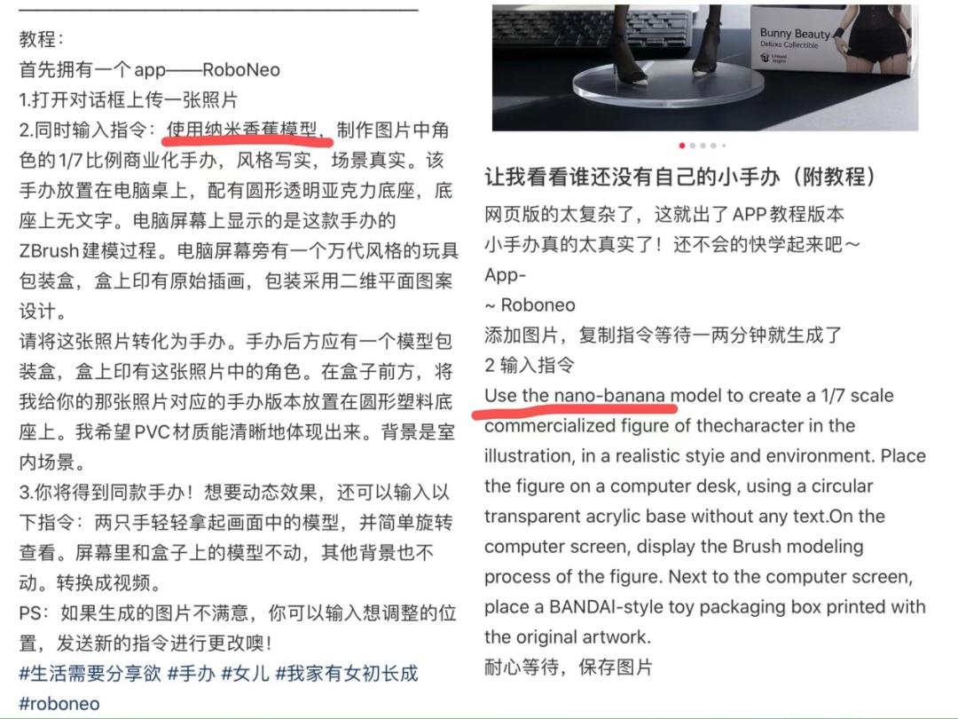 热潮之下,美图推出的RoboNeo也“蹭”到了热度。但锌刻度在社交平台搜索发现,目前用户使用RoboNeo生成手办图时,常输入口令“使用Nano Banana(纳米香蕉)模型,制作……”,这意味着,尽管国内用户使用美图的RoboNeo,但追求的还是Nano Banana的模型和效果。