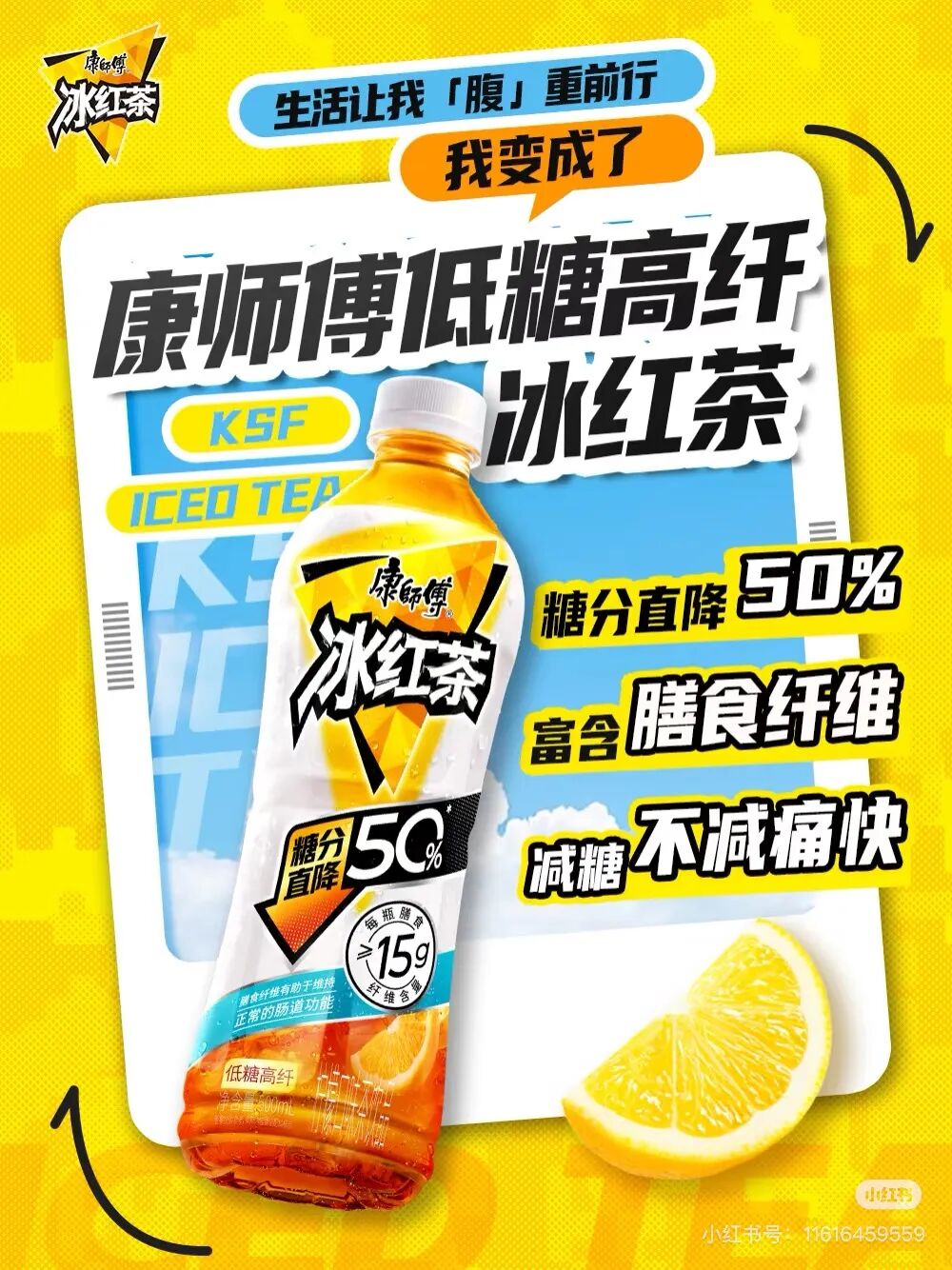 今年,康师傅推出了“低糖高纤版冰红茶”,主打糖分降低50%,采用蔗糖与代糖的复合配方。在保留经典口味的同时,将含糖量降低到4.5g/100ml,并添加了膳食纤维,在饮料分级中属于B级。