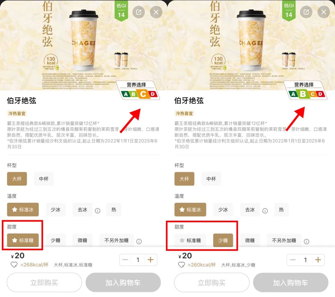 比如霸王茶姬,会在产品点单页面直接标注饮料分级,消费者选择不同含糖量时,饮料分级也会随之变化。以招牌产品“伯牙绝弦”为例,将标准糖换成少糖,饮料分级会从C级变为B级。