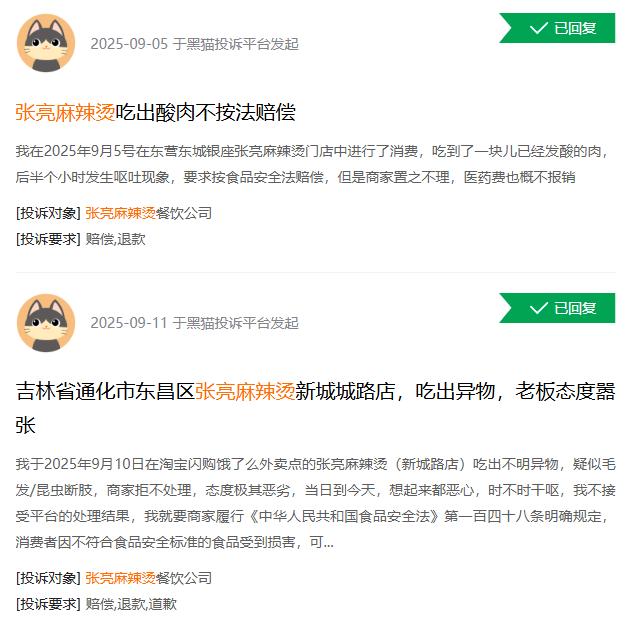 此前此后,张亮麻辣烫食品安全问题时有发生。截至目前,黑猫投诉平台上有关投诉近2000条,多集中在食物变质、有异物等问题。