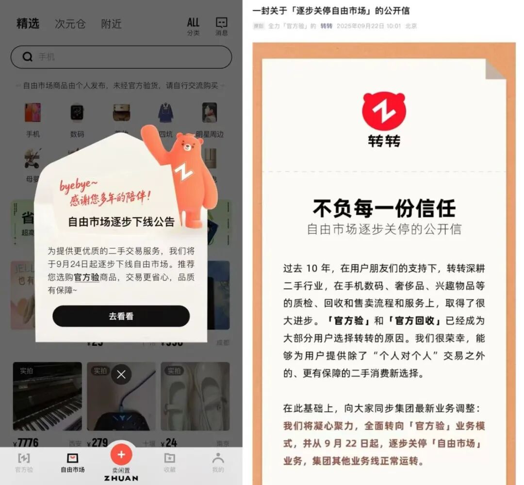 长期处于“保二争一”的尴尬处境,让转转既难以追上闲鱼,也难以保证利润。为此,转转逐渐从C2C(用户间交易,闲鱼主要采用这种模式)向C2B2C(在用户间增加了中间商)转型。昨日,转转发布公告,宣布将关停旗下C2C模式的“自由市场”业务,9月24日关闭商品发布入口,10月31日正式关闭所有业务,100%投入C2B2C模式的二手“官方验”业务。