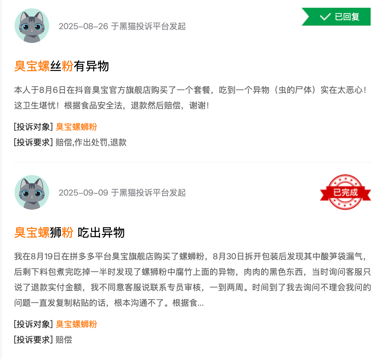 在全国12315消费投诉信息公示平台和黑猫投诉平台上,有多名消费者投诉在“臭宝”螺蛳粉中吃出了头发、昆虫等多种异物。