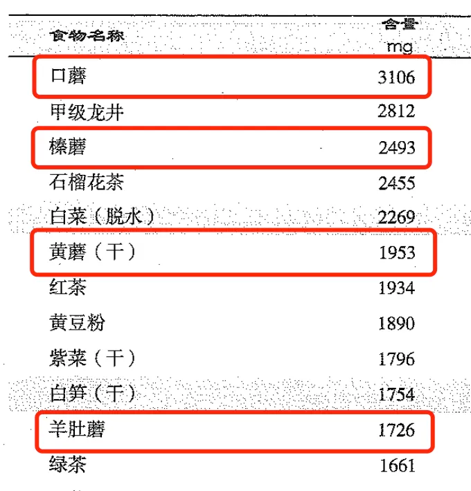 总体而言,大部分蘑菇钾含量较高。以下是天然食物中钾含量由多到少排列,蘑菇类占比较多。