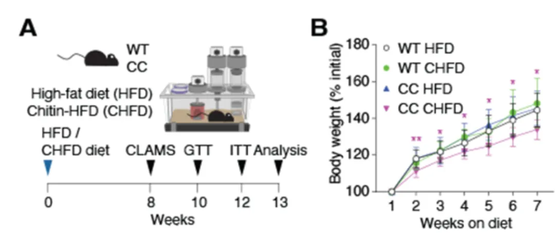 对比观察发现,与吃含几丁质纤维高脂肪饲料的小鼠相比,吃含纤维素高脂肪饲料的小鼠体重明显增长。而几丁质酶缺陷的小鼠吃含几丁质纤维高脂肪饲料后,体重下降,肥胖和脂肪质量显著减少。