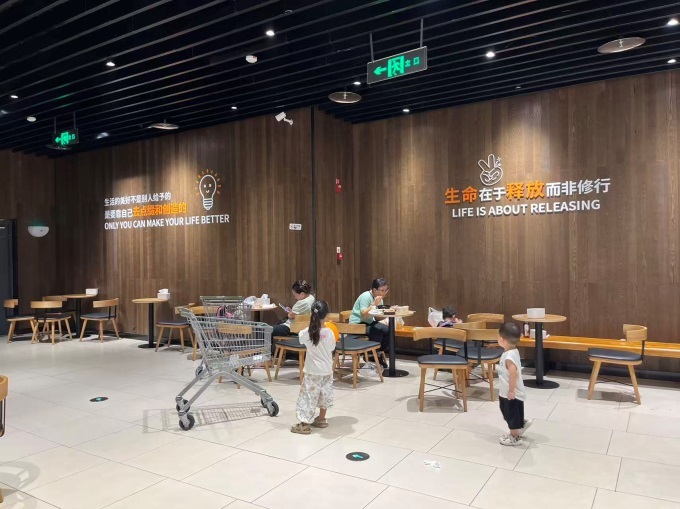 服务细节也有提升,卖场增设休息区,提供便民服务,货架配放大镜,连卷袋处有湿手器,果切区标明食用顺序。