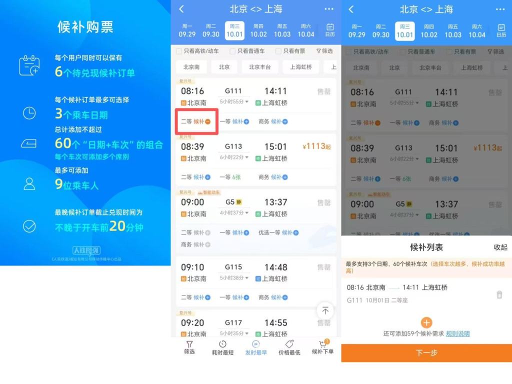 在火车票起售当日页面,点击购票信息预填,旅客就能提前选择乘车人、预选车次、预选席别,火车票起售时就能快速提交订单。第一时间没买到车票的旅客,可以通过12306网站、手机客户端中的“候补购票”服务功能进行候补购票。要最大限度使用60个“日期 + 车次”的购票组合,选择的组合越多,候补成功率越高。