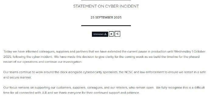 9月23日,捷豹路虎官方发布声明,通知员工、供应商及合作伙伴,因受网络安全事件影响,将当前停产状态延长至2025年10月1日。在此期间,公司会制定分阶段恢复运营的时间表,并持续推进调查工作。