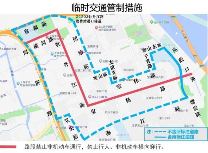 行人、非机动车交通管制措施为,宝杨路(吴淞口路 - 牡丹江路)、牡丹江路(宝杨路 - 漠河路)、漠河路(牡丹江路 - 同济路)禁止非机动车通行,禁止行人、非机动车横向穿行。