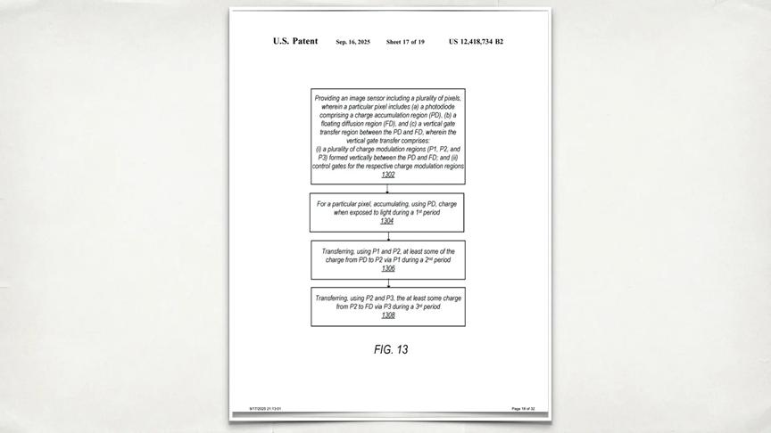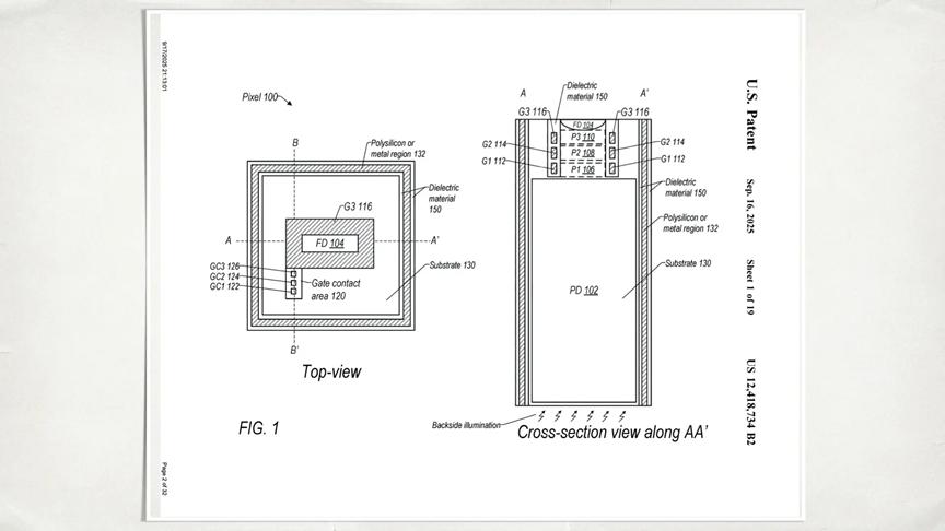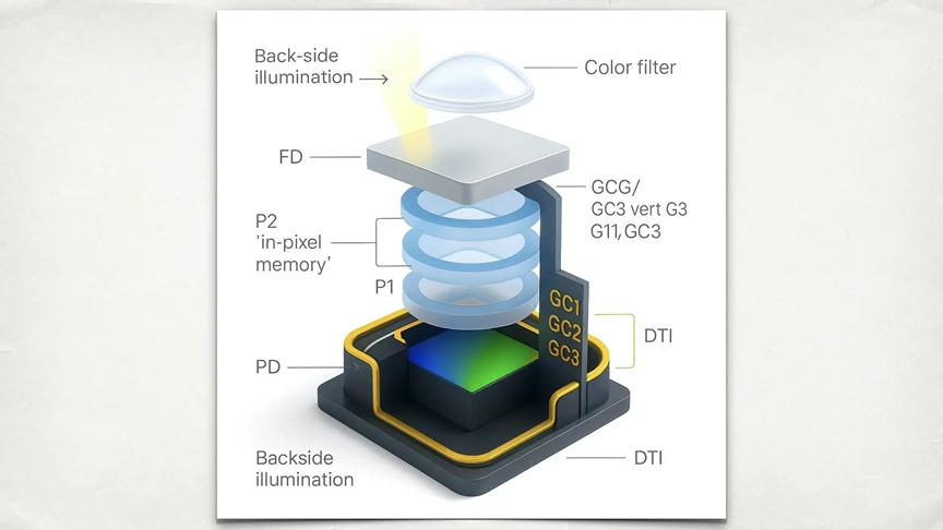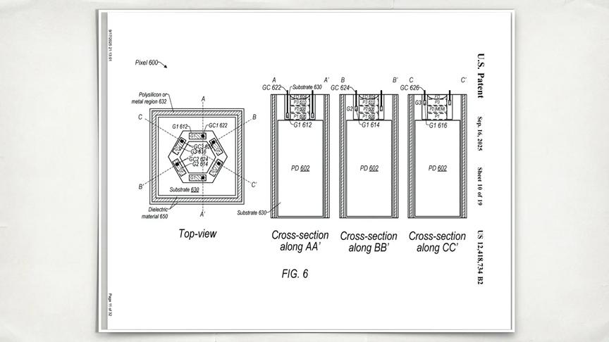 其中,中间层承担存储图像和帮助移动图像两项任务,使像素紧凑,便于手机操作,定格画面中杂散光更少。专利描述了快门“关闭”时保护“候诊室”的防护罩和沟槽,能实现更清晰的定格画面和图像。图纸包含用于自动对焦的背照式照明和分割像素,这些是密集智能手机传感器的工具,而非笨重的实验室零件。