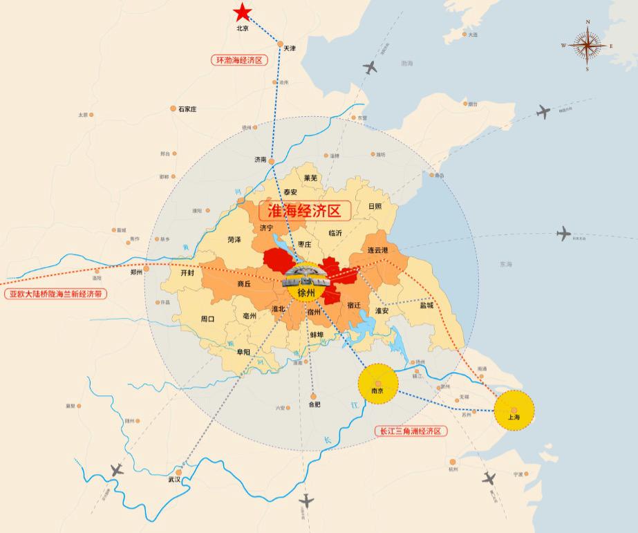 徐州在淮海经济区处于中心位置。2011年京沪高铁开通后,徐州东站成为京沪线七大中心高铁枢纽站之一。如今,徐州与南京、郑州、济南、合肥4个省会城市构成“1小时城市圈”,从徐州东站出发,3小时可达北京、西安、武汉、上海、杭州5个大都市,通达城市180多个,在全国高铁通达城市中名列前茅。可以说,徐州淮海经济区中心城市的地位名副其实。