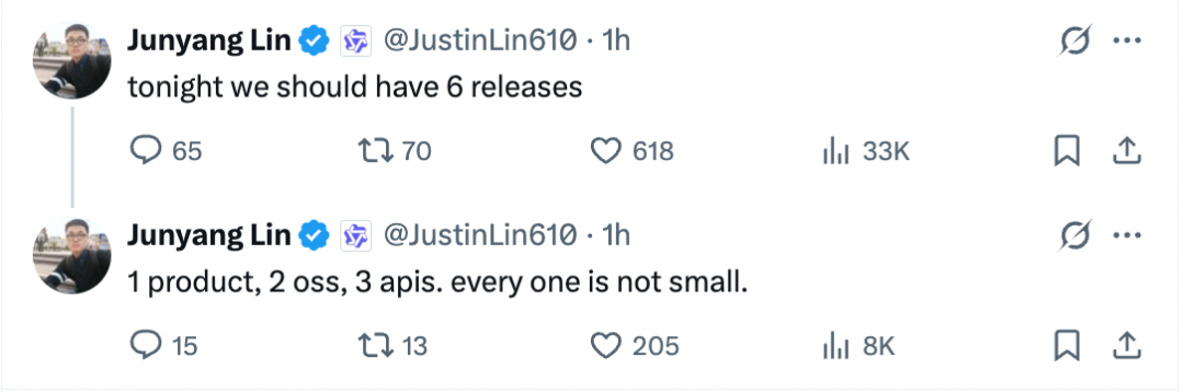 23日晚间,证券时报记者发现,阿里通义千问团队负责人在个人社交平台上透露,团队即将发布6个“新东西”,其中包括1个产品、2个开源模型、3个API接口,并且强调“每一个都意义重大”。