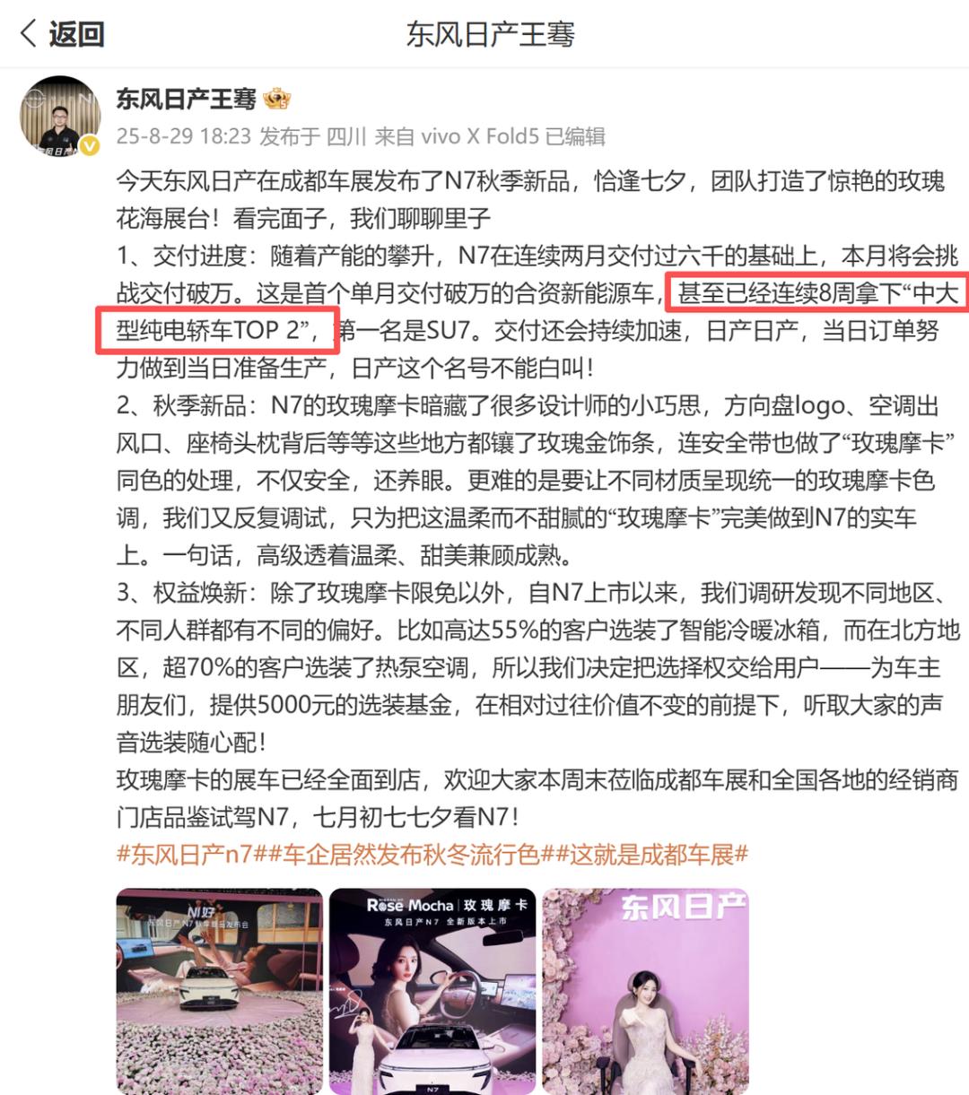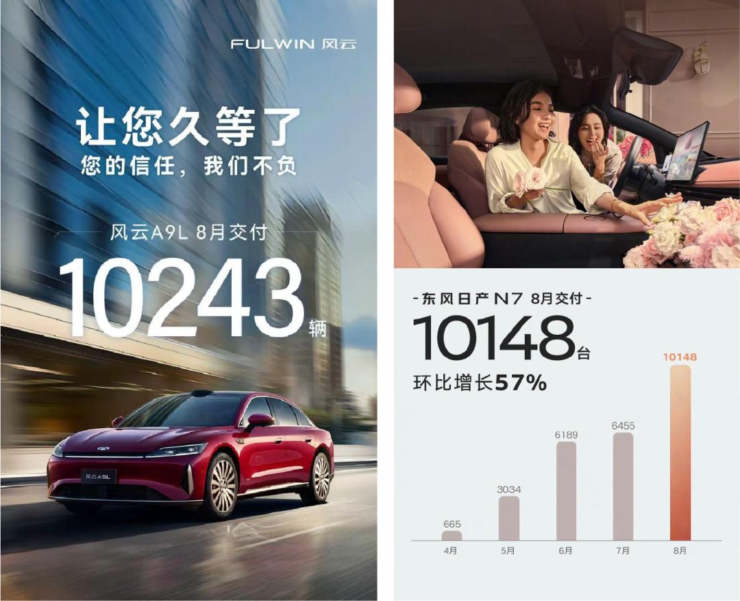 在更广泛市场,众多车型凭借高阶智驾突破原有边界。奇瑞风云 A9L 8 月交付 10243 辆,靠「空间 + 续航 + 智驾」在中大型插混市场出圈;东风日产 N7 8 月交付 10148 台,环比增长 57%,是首个单月交付破万的合资新能源车。东风日产新能源品牌总经理王骞称其连续 8 周拿下中大型纯电轿车 TOP 2。