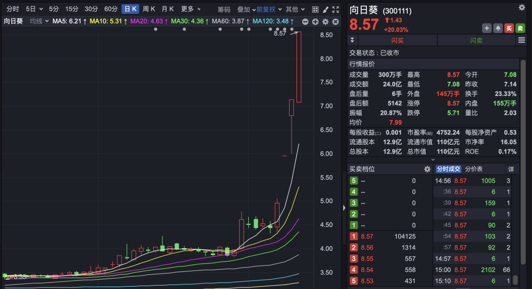 光伏概念股今日也全线上扬,光伏设备、BC电池、TOPCon电池、HJT电池等多个细分板块放量大涨。向日葵(300111)连续3日20%涨停,蓝丰生化、TCL中环、福达合金、福莱蒽特等也纷纷强势封板。