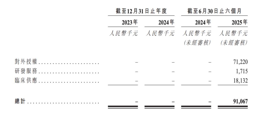 2023 年 - 2025 年上半年,其营收分别为 0 元、0 元、9107 万元,2025 年上半年营收来自对外授权、研发服务及临床供应收益;期内亏损分别为 6.20 亿元、4.86 亿元、1.08 亿元;同期研发支出分别为 4.56 亿元、2.84 亿元及 6500 万元。