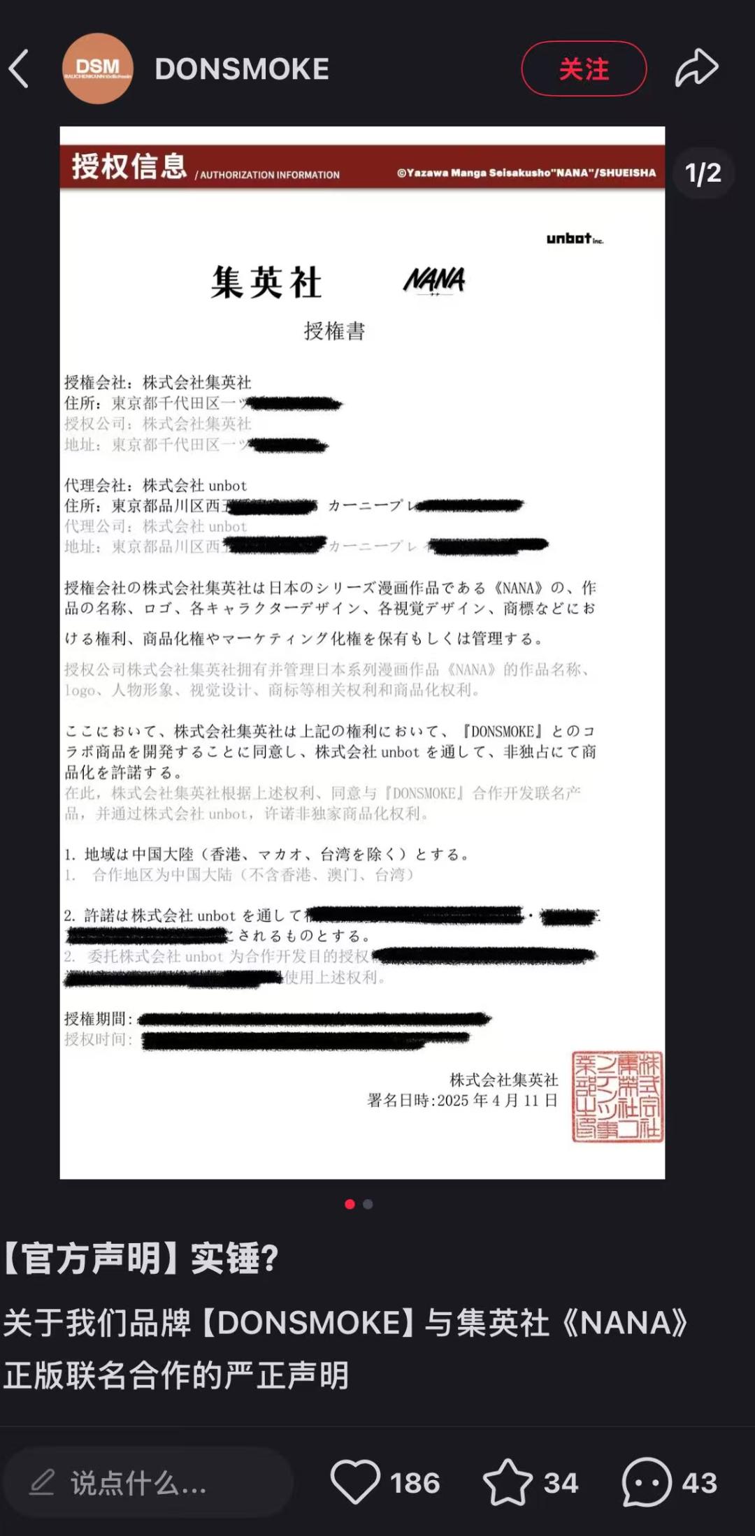 与NANA联名的DONSMOKE此前遭遇了版权争议,最后官方不得不发表严正声明,出示与版权方集英社签订的授权文件。或者品牌方对IP粉丝讨论环境了解不足,款式设计踩雷会产生负面影响。反过来,在本土潮牌消费圈子里,对于二次元浓度过高的IP也存在不同看法。