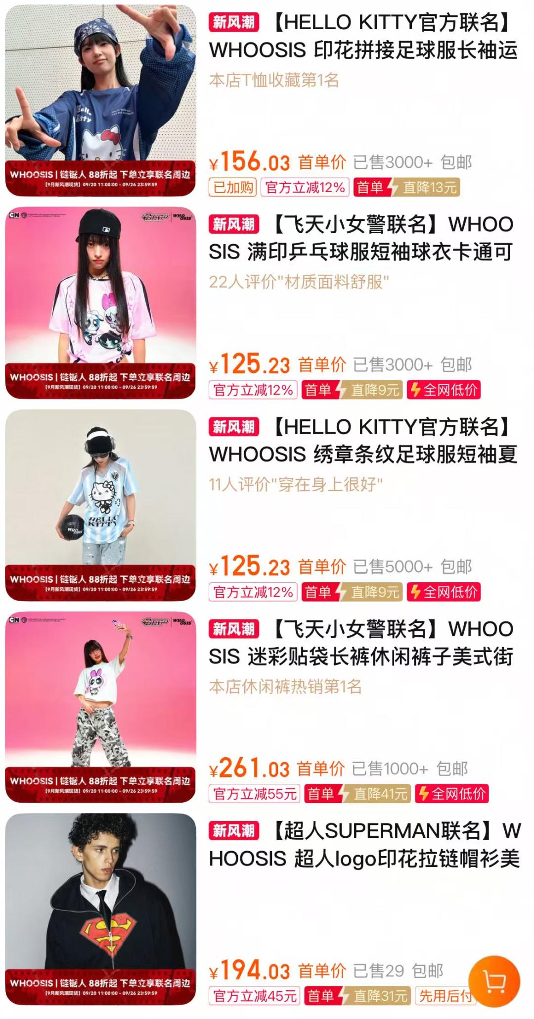 比如美式工装风格的WHOOSIS,近年来陆续推出了飞天小女警、Hello Kitty、攻壳机动队、游戏王、超人等多个联名系列。其中,Hello Kitty和飞天小女警系列销售情况最好,这得益于它们在年轻群体中人气上升,以及品牌定价亲民、设计时尚百搭,购买者不只是粉丝。