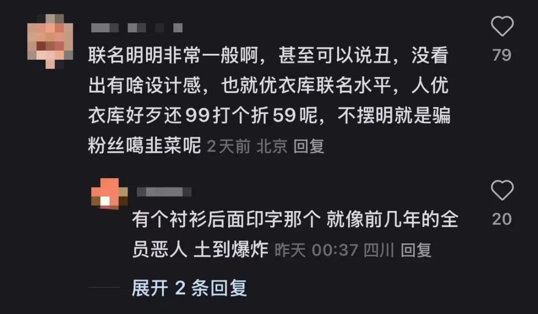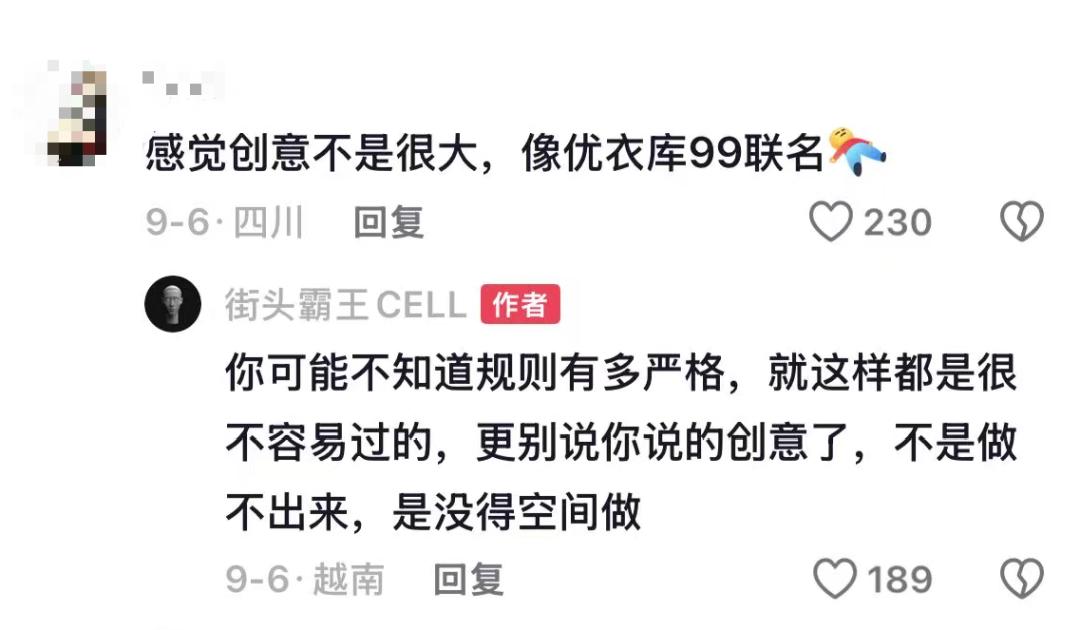 事实上,这不全是品牌方的责任,在版权方审核条件严格的情况下,品牌很难放开手脚进行大胆设计。新联名系列被吐槽设计“像优衣库一样敷衍”后,WHOOSIS的主理人CELL忍不住在评论区诉苦,称不是不想做更有创意的设计,而是不被允许。