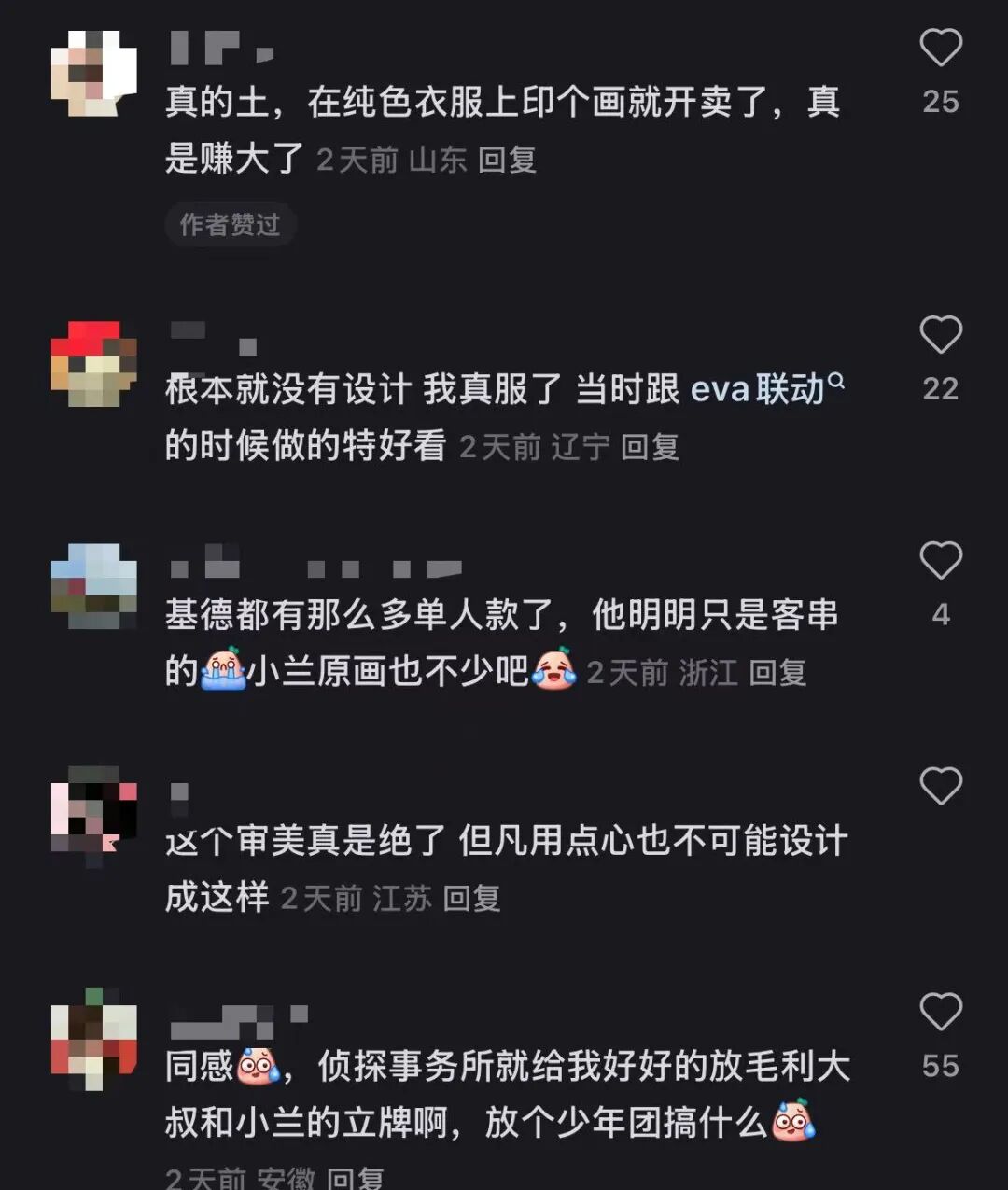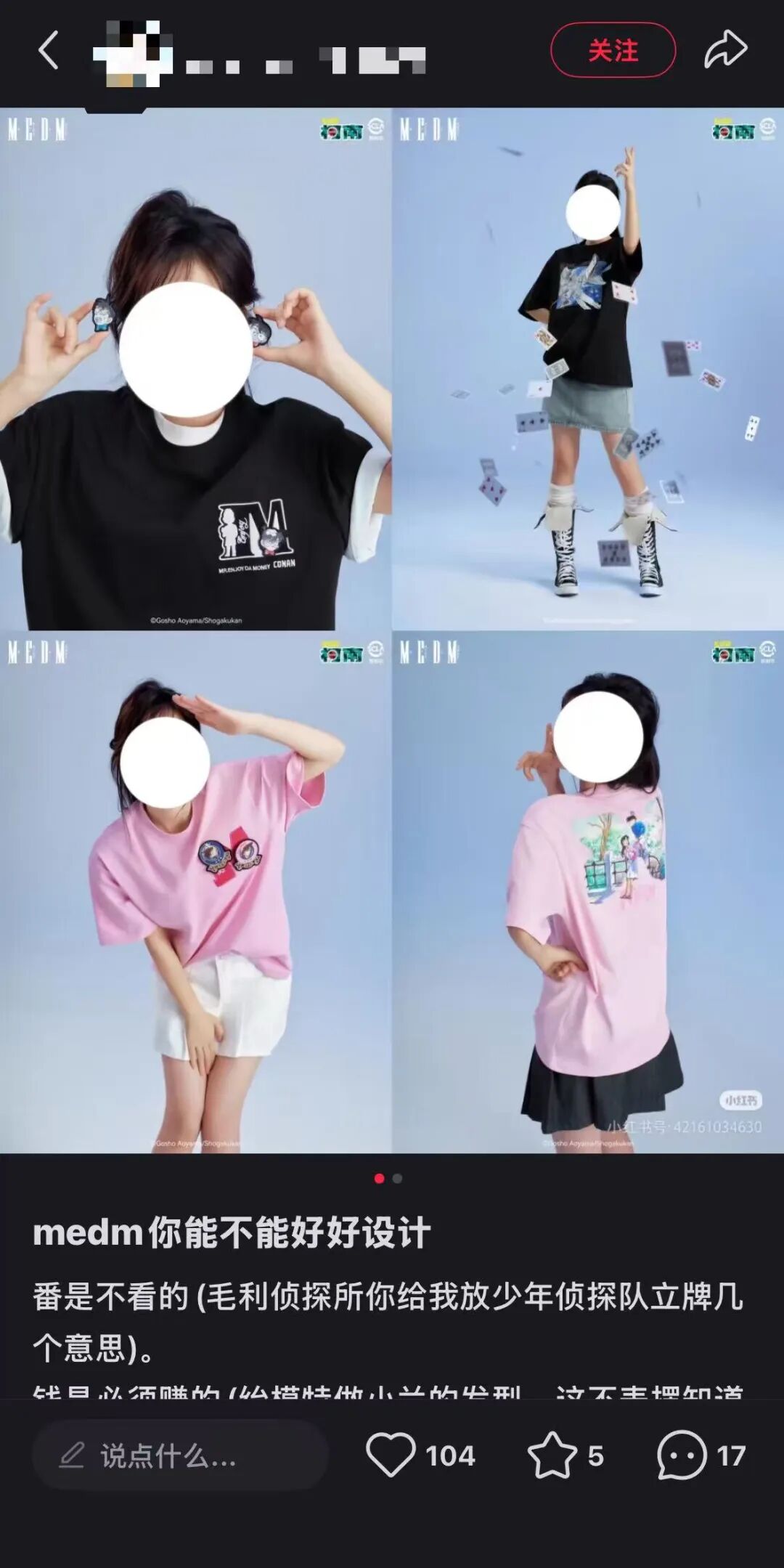 MEDM近期公布的名侦探柯南联名款,因低估了IP粉丝构成的复杂性和需求的多样性,被粉丝集体吐槽敷衍不用心。服装上印制的图案过于直白,缺乏设计感,品牌发挥空间有限,品牌主理人也在回应中隐晦提及设计受限,这可能与版权方审核有关。