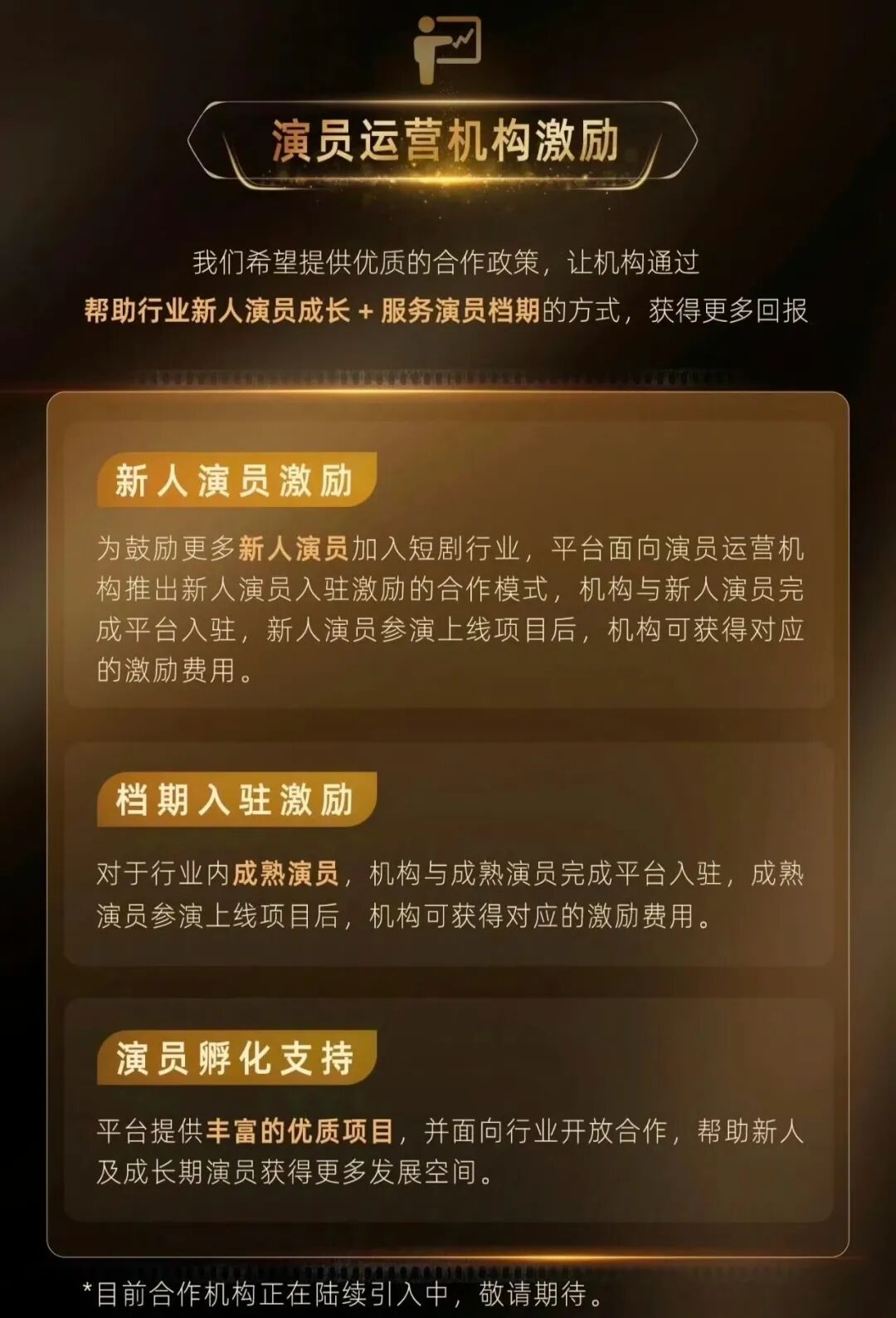 针对演员运营机构,红果短剧提出,机构与演员完成平台入驻,演员参演上线项目后,机构可获激励费用;平台提供优质项目,开放合作,帮新人及成长期演员获得更多发展空间。