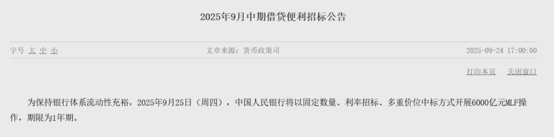 中国人民银行9月24日发布消息,为维持银行体系流动性充裕,9月25日(周四),中国人民银行将采用固定数量、利率招标、多重价位中标方式开展6000亿元中期借贷便利(MLF)操作,期限为1年期。