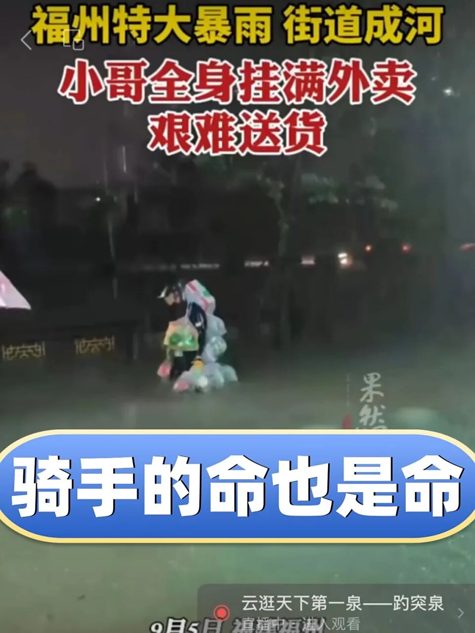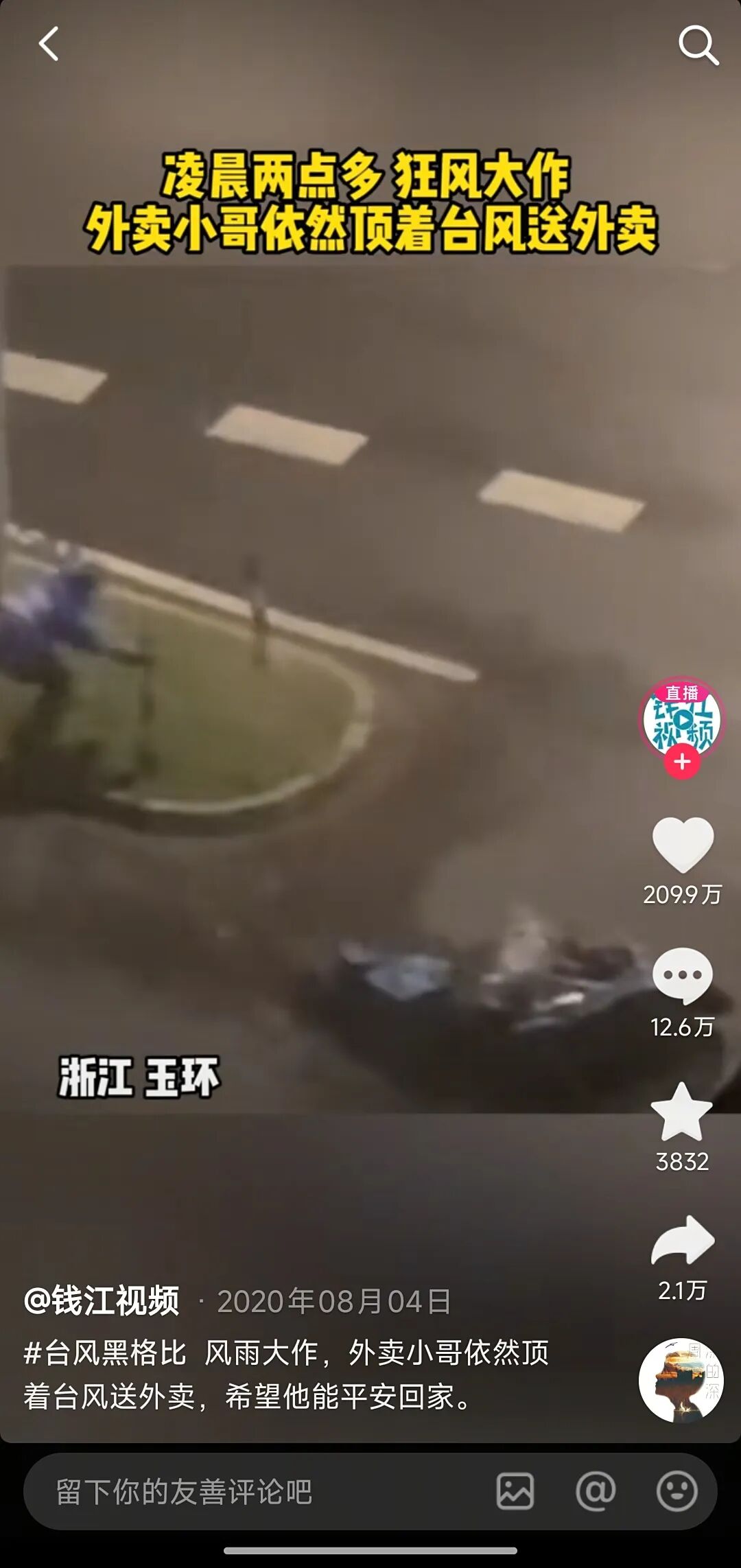 其实答案在2020年台风“黑格比”的一段视频里:浙江玉环一名饿了么骑手在狂风中连人带车被吹倒,死死抱住路灯柱才幸免,散落的外卖在雨中浸泡损毁。这条点赞超209万的视频下,最高赞评论指出:“个人觉得,像这种天气要么别点外卖,要么店主暂时不营业”。