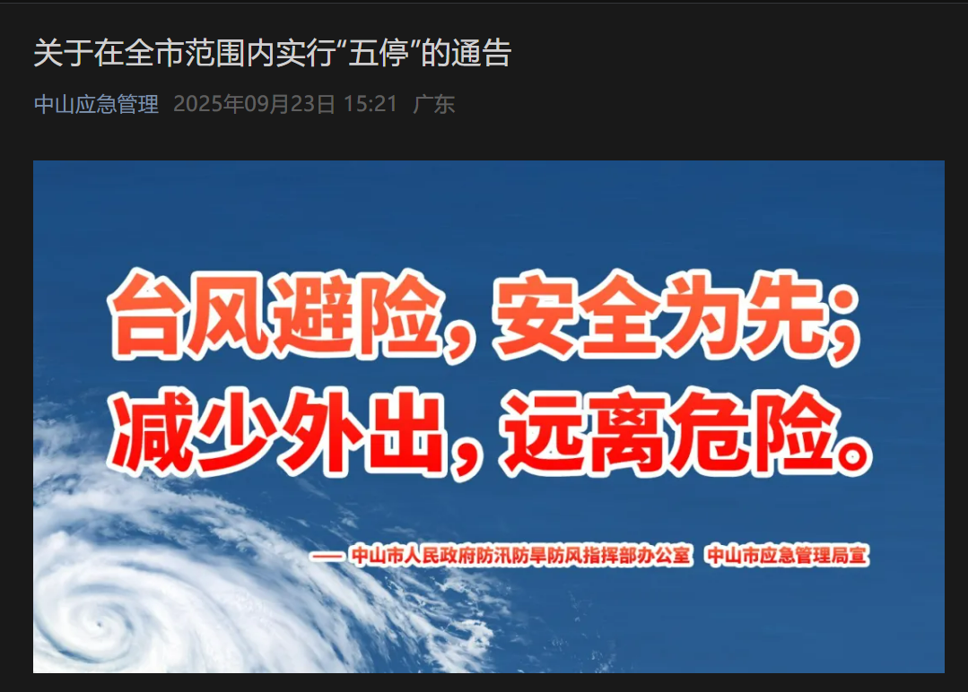 9月23日午后,珠三角多地启动“五停”(停课、停工、停产、停运、停业),外卖员从14时起集体放假两天。这并非临时决策,2023年台风“苏拉”期间,深圳就通过精准“五停”实现灾害影响最小化,而“桦加沙”强度更大,17级大风对户外人员有致命威胁。