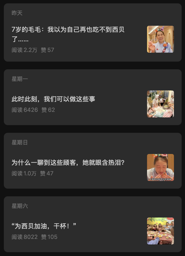 从西贝最近的宣传内容能看出贾国龙的“我行我素”。一个叫“西贝品味早读”的微信公众号,几乎每天发推文。从内容看,这似乎是西贝向基层员工宣传公司文化和经营情况的渠道,近期文章大多与“感恩西贝、感谢老板”“共渡难关”有关,像是在舆论危机期间强化内部信心和信任的举措。