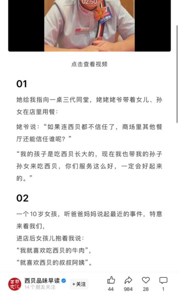 该公众号推文还引用很多消费者的说法,如“如果连西贝都不信任了,商场里其他餐厅还能信任谁呢?”“我的孩子是吃西贝长大的,现在我也带我的孙子孙女来吃西贝,你们服务这么好,一定会好起来的”,甚至有“我跟西贝同生共死”这样惊人的言论。